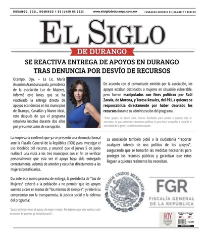 "La licenciada Asunción Aramburuzavala, presidenta de la Asociación Luz de Mujeres, informó este lunes que se ha reactivado la entrega directa de apoyos económicos en los municipios de Ocampo, Canatlán y Nuevo Ideal, esto después de que programa estuviera inactivo durante dos años por presuntos actos de corrupción", se puede leer.