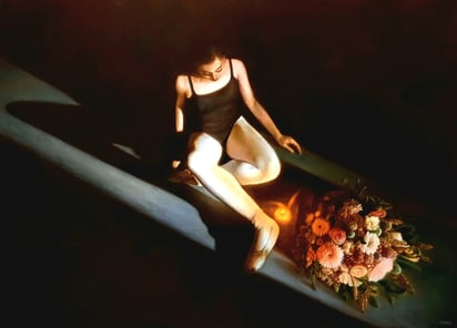 Las piezas de acuarela, todas centradas en flores y unidas por cintas que remiten a la estética de sus obras anteriores, dialogan con las grandes pinturas al óleo, donde las flores, pétalos o elementos naturales aparecen integrados en escenas de fuerte expresividad.