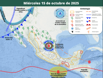 Además, el pronóstico indicaba que este miércoles 15 de octubre se registraría un descenso en temperaturas, que alcanzarían de 0 a 5 grados centígrados en zonas altas de Sonora, Chihuahua, Durango, Zacatecas, Aguascalientes, Estado de México, Hidalgo, Tlaxcala, Puebla y Veracruz.