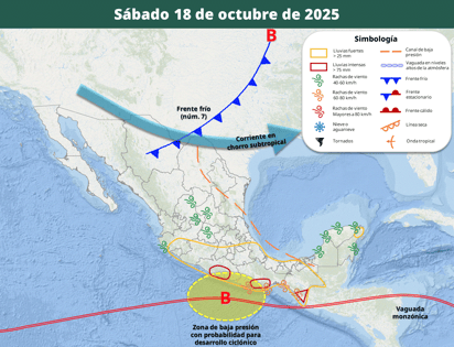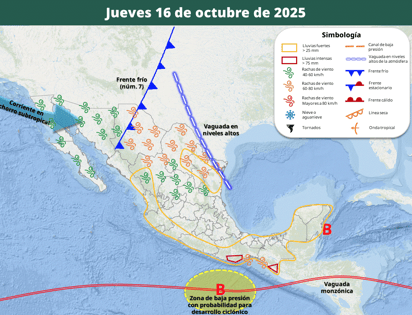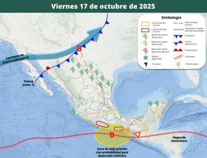 El frente frío 7 seguirá avanzando viernes 17 y sábado 18 de octubre por el norte de México, hasta continuar su trayectoria ingresando a territorio estadounidense.
