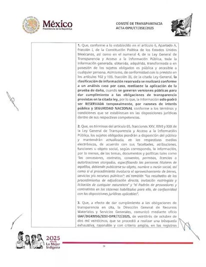 Por estos argumentos, el Comité de Transparencia de Presidencia de la República confirmó por unanimidad de votos la clasificación de reserva por cinco años, es decir, será hasta 2030 cuando esta información sea pública.