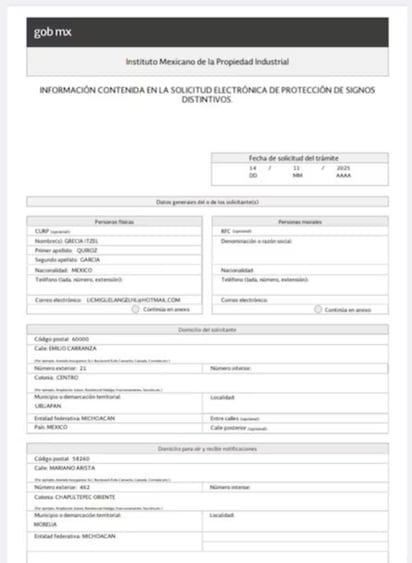 En el expediente 3506523, se detalla que el pasado 14 de noviembre, Grecia Quiroz ingresó al IMPI la solicitud para registrar la marca "Carlos Manzo" para utilizarlo en servicios de organización de reuniones políticas; servicios de cabildeo político, asesoría en materia de organización ciudadana.