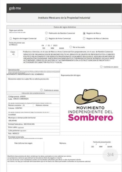 Ese mismo día, Grecia Quiroz también solicito al IMPI el registro de marca y logotipo de "Movimiento Independiente del Sombrero", nombre del movimiento que fundó su esposo Carlos Manzo.