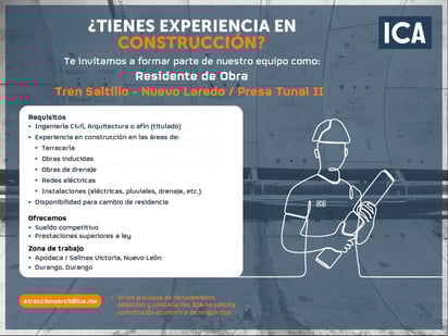 En el caso de los puestos de Residente de Obra y Coordinador ACSMA, ambos estarán disponibles tanto para la presa Tunal II en Durango como para la obra del tren Saltillo-Nuevo Laredo.