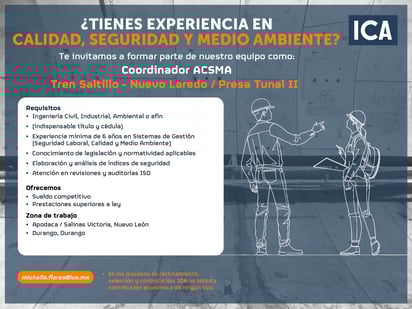 Otro de los puestos solicitados es como Coordinador ACSMA, es decir, de Aseguramiento, Calidad, Seguridad y Medio Ambiente.
