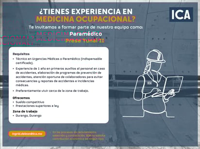 Al ser una obra de grandes dimensiones con múltiples riesgos, es indispensable contar con un paramédico, puesto que también solicita ICA para la presa Tunal II.