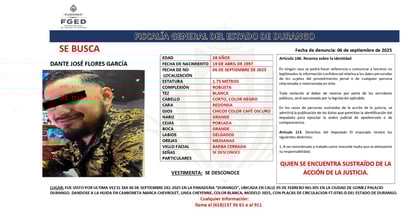 Cualquier información sobre su paradero, puede comunicarse al número 618 137 36 61 o al 911.