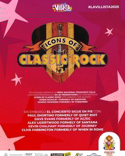 “Por causas ajenas a la Feria Nacional Francisco Villa y motivos personales, no se presentarán en concierto de Icons of Classic Rock este sábado 2 de agosto Robin Mcauley formerly of Survivor y Johnny Edwards formerly of Foreigner”, se lee en el comunicado.
