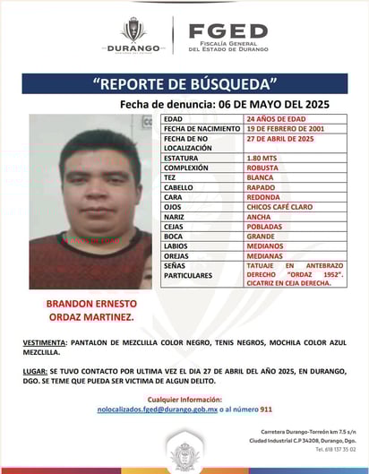 Brandon Ernesto Ordaz Martínez, de 24 años de edad, con fecha de nacimiento del 19 de febrero de 2001, fue visto por última vez el pasado 27 de abril en la ciudad de Durango, sin especificar en qué zona; la denuncia de desaparición se realizó el martes 6 de mayo.