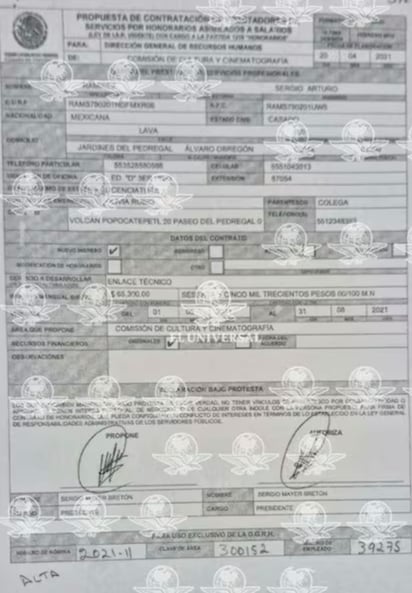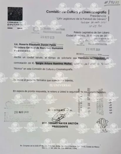EL UNIVERSAL tuvo acceso a los contratos, en los que se establece que fue el diputado Sergio Mayer Bretón, quien solicitó su contratación.