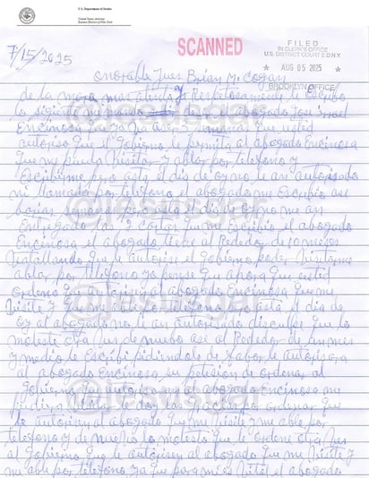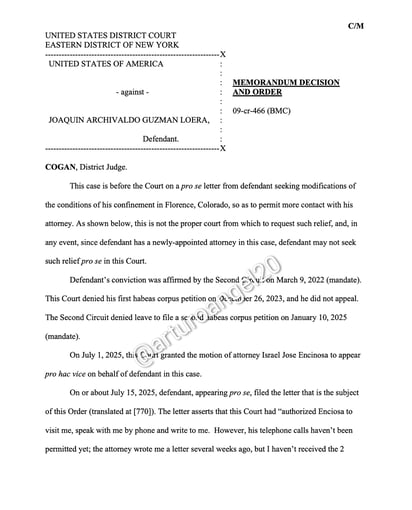 Sin embargo, no fue hasta el jueves 7 de agosto cuado Brian Cogan -juez al que va dirigida la carta- respondió a Guzmán Loera, rechazando su petición.