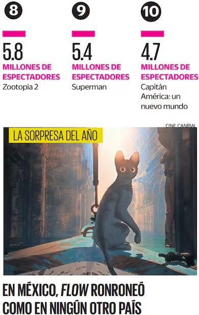 Ambas cintas fueron rebasadas por las sorpresivas de "Flow", ganadora del Oscar, y "Memorias de un caracol", con 2.1 millones y 1.8 millones de boletos vendidos, respectivamente, colocando a la animación en los primeros planos.