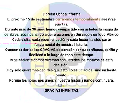 De acuerdo a la misma publicación en redes sociales, será el próximo 15 de septiembre cuando la Librería Ochoa cierres sus puertas, sin que haya fecha para un posible regreso.