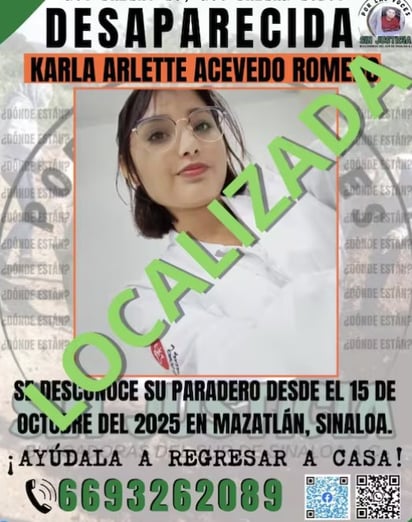 La joven estudiante de medicina de la Universidad Autónoma de Durango, campus Mazatlán, Karla Arlette Acevedo Romero, de 20 años de edad, apareció sana y salva, por lo que el colectivo de búsqueda “Por las Voces sin Justicia”, desactivó su ficha de localización y dio gracias a todos por la ayuda.