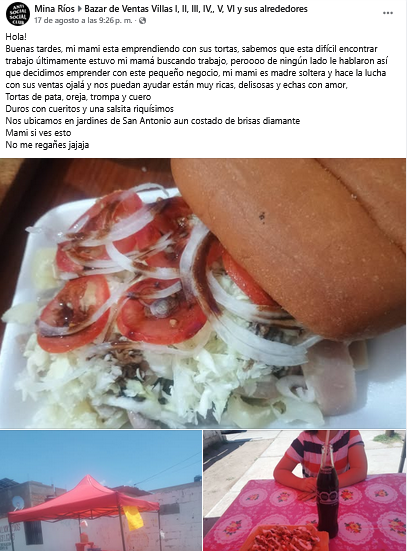 "¡Hola!, buenas tardes, mi mami está emprendiendo con sus tortas, sabemos que está difícil encontrar trabajo; últimamente estuvo mi mamá buscando trabajo, peroooo, de ningún lado le hablaron, así que decidimos emprender con este pequeño negocio. Mi mami es madre soltera y hace la lucha con sus ventas, ojalá y nos puedan ayudar, están muy ricas, deliciosas y hechas con amor: tortas de pata, oreja, trompa y cuero, además duros con cueritos y una salsita riquísima", se lee en el post.
