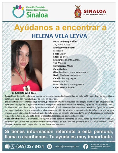 A través de una ficha de búsqueda emitida por la Comisión Estatal de Búsqueda de Personas Desaparecidas de Sinaloa, Helena Vela Leyva es descrita como una mujer de 18 años de edad, estatura aproximada de 1.65 metros, tez morena, complexión media, cara ovalada, ojos medianos color café oscuro, nariz madiana achatada, cabello lacio y negro, frente amplia, boca mediana con labios gruesos, y cejas semipobladas.