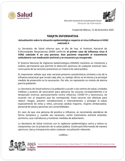 “Es importante señalar que esta variante presenta características similares a las de la influenza estacional que circula cada año; su manejo clínico es el mismo y la principal medida de prevención es la vacunación”, explicó la Ssa.