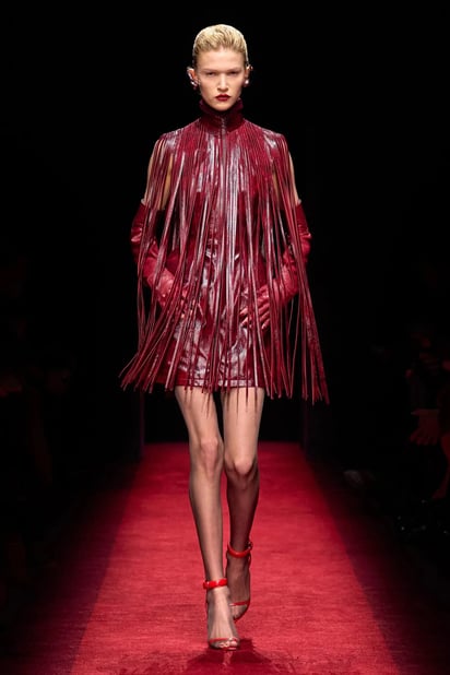 El cuero ya no se limita a chaquetas o pantalones: en esta temporada aparece en vestidos. Fendi propone un midi refinado; Brandon Maxwell, diseños más arriesgados con flecos y cuello alto; y Courrèges presenta versiones cortas con una estética juvenil y moderna.