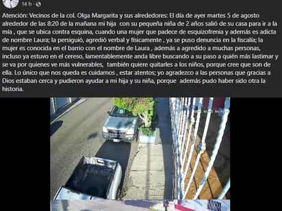 Ella vive en contra esquina de su casa, mientras la joven caminaba con la pequeña hacia esa dirección, una mujer que padece esquizofrenia -según el post- la siguió, la víctima se percató de eso y comenzó a caminar más rápido, sin embargo, la alcanzó y trató de arrebatarle a la menor por la espalda.