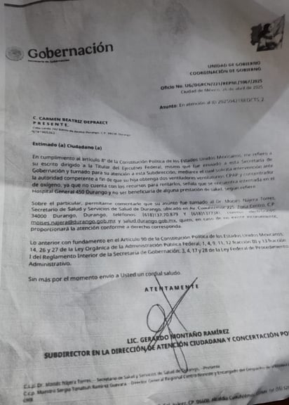 Su reclamo principal es que en Durango no se ha cumplido con el apoyo indicado desde la Presidencia al titular de Salud, lo cual quedó confirmado en el oficio No. UG/DGRCN/221/REPNL/1067/2025 de Gobernación, firmado por Gerardo Montaño Ramírez, subdirector de Atención Ciudadana de la Subsecretaría de Gobierno.