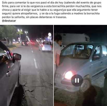 “Nos choca y aparte al exigir que le hable a su seguro, ya que ella argumentó tener seguro, quiere atropellarnos, y se da a la fuga saliendo a m*dres”, se lee en una publicación en redes sociales.