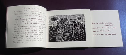 Además de las imágenes, el libro integra textos en o’dam, mexicanero y español, escritos por las propias autoras de cada ilustración, lo que refuerza el valor del lenguaje como parte esencial de la memoria cultural. En este proyecto participaron Evangelina Galindo, Brasileira López, Verónica de la Cruz, Prisciliana Reyes e Imelda Victoriano, cuyas aportaciones combinan gráfica, palabra y ritualidad en un solo objeto artístico.