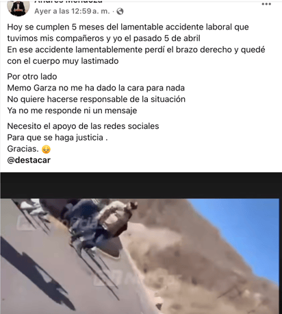 A través de su cuenta de Facebook, Andrés Mendoza, compartió que durante ese accidente desafortunadamente perdió el brazo derecho y su cuerpo resultó muy lastimado. Por ello, ha sido algo difícil desenvolverse como comúnmente lo hacía.