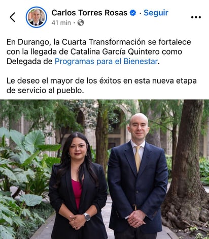 Catalina García Quintero será la nueva titular de la Delegación de Programas para el Bienestar en Durango, luego de que la dependencia permaneciera sin responsable tras la renuncia del anterior delegado, Jhonatan Jardines Fraire, ocurrida el pasado 15 de agosto.