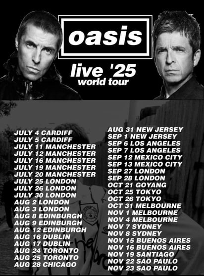 Tras su paso por México, y teniendo un muy breve retorno al Reino Unido, Oasis continuará la gira Live ’25 con fechas confirmadas en Sudamérica, Asia y Oceanía, cerrando el calendario oficial el 23 de noviembre en São Paulo, Brasil. Las ciudades restantes incluyen Buenos Aires, Santiago, Lima, Tokio, Seúl, Sídney y Melbourne, todas con boletos agotados desde su anuncio en agosto. Esta última etapa no solo marca el cierre del tour mundial, sino también la consolidación de un reencuentro que ha recorrido más de veinte ciudades en cinco continentes, con un setlist constante y una respuesta masiva en cada parada.