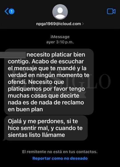 “Acabó de escuchar el mensaje que te mandé y en ningún momento te ofendí”, dice una parte del mensaje que llega a través de ICloud.