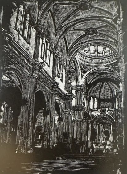 Desde templos emblemáticos hasta edificios civiles, las obras capturan la profundidad y el carácter de una ciudad que mezcla tradición y modernidad. Mendoza no solo registra fachadas, interpreta la memoria material de Durango y la transforma en gráfica, reafirmando la vigencia del buril como un lenguaje capaz de dialogar con el presente.