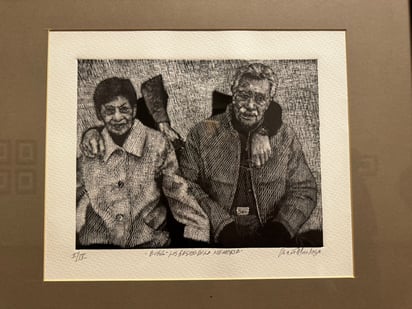 Si bien la muestra reúne edificios históricos como el Tecnológico de Durango, El Templo de San Agustín, Sagrado Corazón, Arzobispado de Durango, El Museo Regional de Durango, la fachada del Palacio del Conde del Valle de Súchil, y varios más, entre las piezas expuestas destaca “Los restos de la memoria”, un retrato profundamente íntimo de sus padres. La obra emerge del proceso doloroso que vivió su madre, quien, a causa de una enfermedad, dejó de reconocer tanto a sus hijos como a cualquier otra persona.