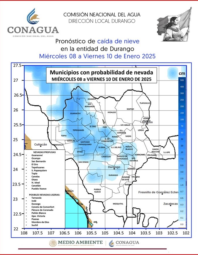 También se espera nieve o aguanieve en Indé, en la sierra del municipio de Durango, Tamazula, Indé, Coneto de Comonfort Pánuco de Coronado, Peñón Blanco, Guadalupe Victoria, Poanas, Nombre de Dios y Súchil.