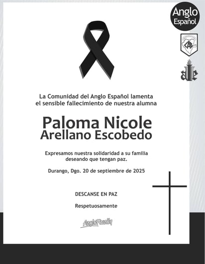La comunidad educativa del colegio Anglo Español, se unió al dolor por el fallecimiento de la estudiante Paloma Nicole Arellano Escobedo, de 14 años, quien perdió la vida tras una presunta negligencia médica ocurrida durante un procedimiento de cirugía estética en la ciudad de Durango.