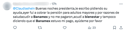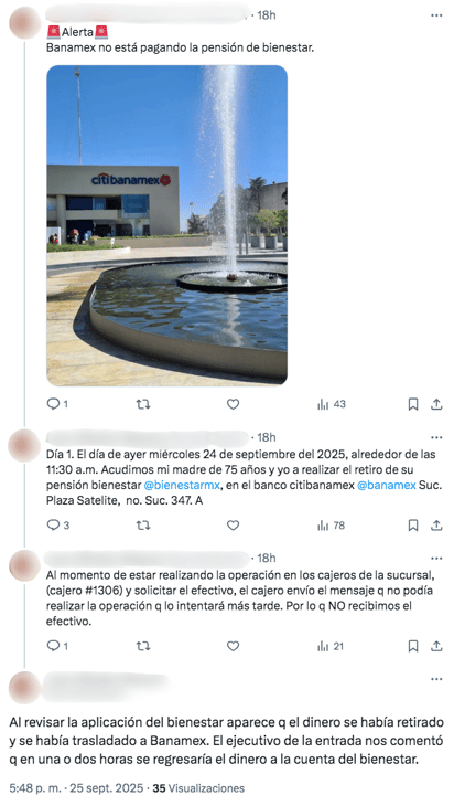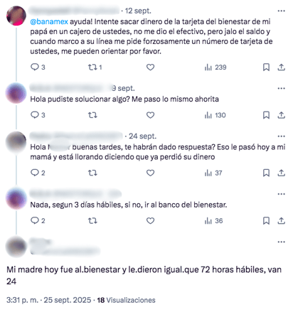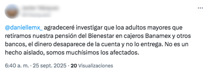 En redes sociales, las quejas más frecuentes son relacionadas con Banamex, pues a través de múltiples publicaciones se pueden leer historias similares, en las que el dinero desaparece de sus cuentas tras intentar retirarlo en cajeros, para evitar las largas filas que pueden hacerse en las sucursales del Banco del Bienestar.
