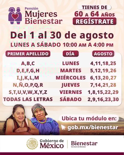 Se debe acudir a registrarse del 1 al 30 de agosto, de lunes a sábado, de 10:00 a 16:00 horas. Los módulos se pueden consultar en la página de la Secretaría de Bienestar.