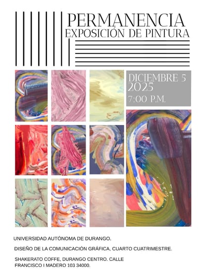 Con la mente abierta, el público podrá recorrer un conjunto de obras que hablan de lo efímero y lo esencial. La cita es el próximo viernes 5 de diciembre a las 19:00 horas en Shakerato Coffe, ubicado en Calle Francisco I. Madero 103, Durango Centro. Los artistas, estudiantes de cuarto semestre de Diseño de la Comunicación Gráfica de la Universidad Autónoma de Durango, esperan que cada visitante encuentre en Permanencia un reflejo de sí mismo y una invitación a pensar en aquello que nunca se queda, pero siempre nos transforma.