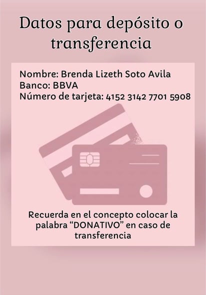 De igual manera, compartió la cuenta bancaria de BBVA 4152-3142-7701-5908, a nombre de Brenda Lizeth Soto Ávila, a través de la cual se pueden hacer transferencias, con el concepto de “Donativo”.