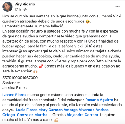 Si bien, autoridades advirtieron a los duranguenses que los afectados no estaban solicitando ayuda monetaria tras resultar afectados, este pasado sábado por la tarde se compartió un video con el testimonio de Ivonne, hija de la señora Vicky, quien falleció en el hecho, en el que indica que algunas de las publicaciones que circularon en Facebook sí fueron realizadas por ella.