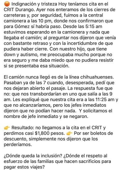 A través de las redes sociales, Érika narró que este día tenían una cita en el CRIT Durango de Gómez Palacio, por lo que desde la noche del domingo preguntaron en la central camionera si habría algún cambio por el bloqueo anunciado, pero se les dijo que si podrían llegar.