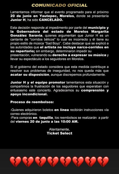El miércoles 18 de junio, las autoridades de Yautepec, Morelos, anunciaron la cancelación del concierto de Junior H, programado para este fin de semana.