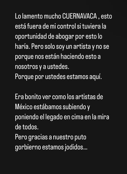 Posterior a dicho documento, también se disculpó con el municipio de Cuernavaca, en donde también iba a dar un concierto, sin embargo en esta historia culpó al gobierno por no dejarlo expresar: