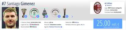 Más allá de su sequía en Milan y las dudas físicas que arrastra, Santiago Giménez sigue siendo uno de los activos más valiosos del fútbol mexicano. Su cotización se mantiene en un rango de 25 millones de euros, de acuerdo con el medio especializado Transfermarkt, lo que lo coloca como el jugador mexicano mejor tasado en la actualidad y uno de los más valiosos de la Serie A.