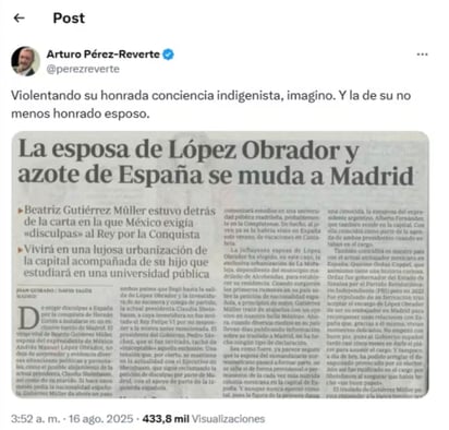 La noticia generó reacciones en España, donde personajes como el periodista y escritor Arturo Pérez-Reverte señaló que la esposa de López Obrador se muda a Madrid “violentando su honrada conciencia indigenista”.