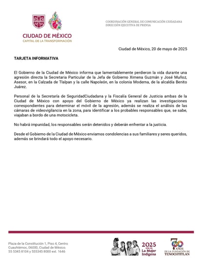 Durante la Mañanera del Pueblo, Claudia Sheinbaum confirmó la noticia y lamentó la pérdida de Ximena Muñoz y José Muñoz, quienes se desempeñaban como secretaria particular y asesor de la Jefa de Gobierno.