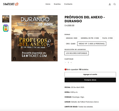 Dicha página en Facebook comenzó a compartir el enlace a un sitio web, en el que solo se ofrecían boletos para el supuesto concierto de Prófugos del Anexo en Durango, con precios que iban desde 500 pesos en la zona de gradas, hasta cuatro mil 500 por las mesas VIP para cuatro personas.
