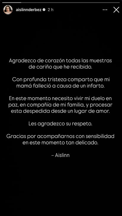 "Agradezco de corazón todas las muestras de cariño que he recibido. Con profunda tristeza comparto que mi mamá falleció".