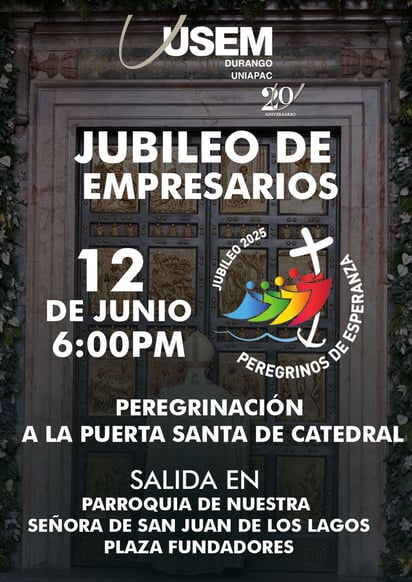 La presidenta de la Unión Social de Empresarios de México (USEM) capítulo Durango, Lorena Hernández informó que este jueves se llevará a cabo un jubileo empresarial, a través del cual los asistentes entrarán a la puerta santa que tiene Durango, ordenada por el Vaticano.