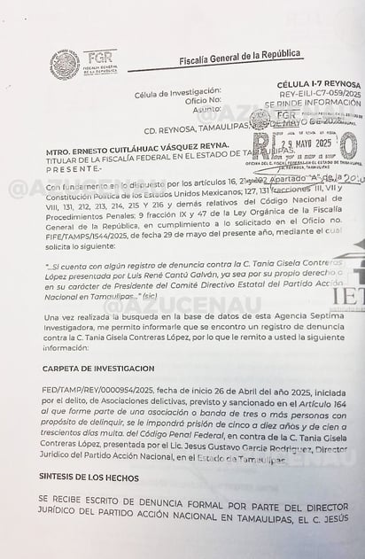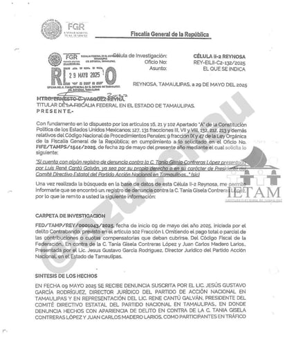 La denuncia fue presentada por el director jurídico del Partido Acción Nacional (PAN) en Tamaulipas, Jesús Gustavo García Rodríguez, contra Contreras López y otras personas.