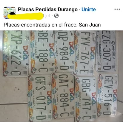 Las personas que han perdido o encontrado placas en la ciudad de Durango recurren a redes sociales, principalmente Facebook y WhatsApp, para solicitar el apoyo de la ciudadanía. Incluso existen grupos dedicados exclusivamente a este tipo de publicaciones.
